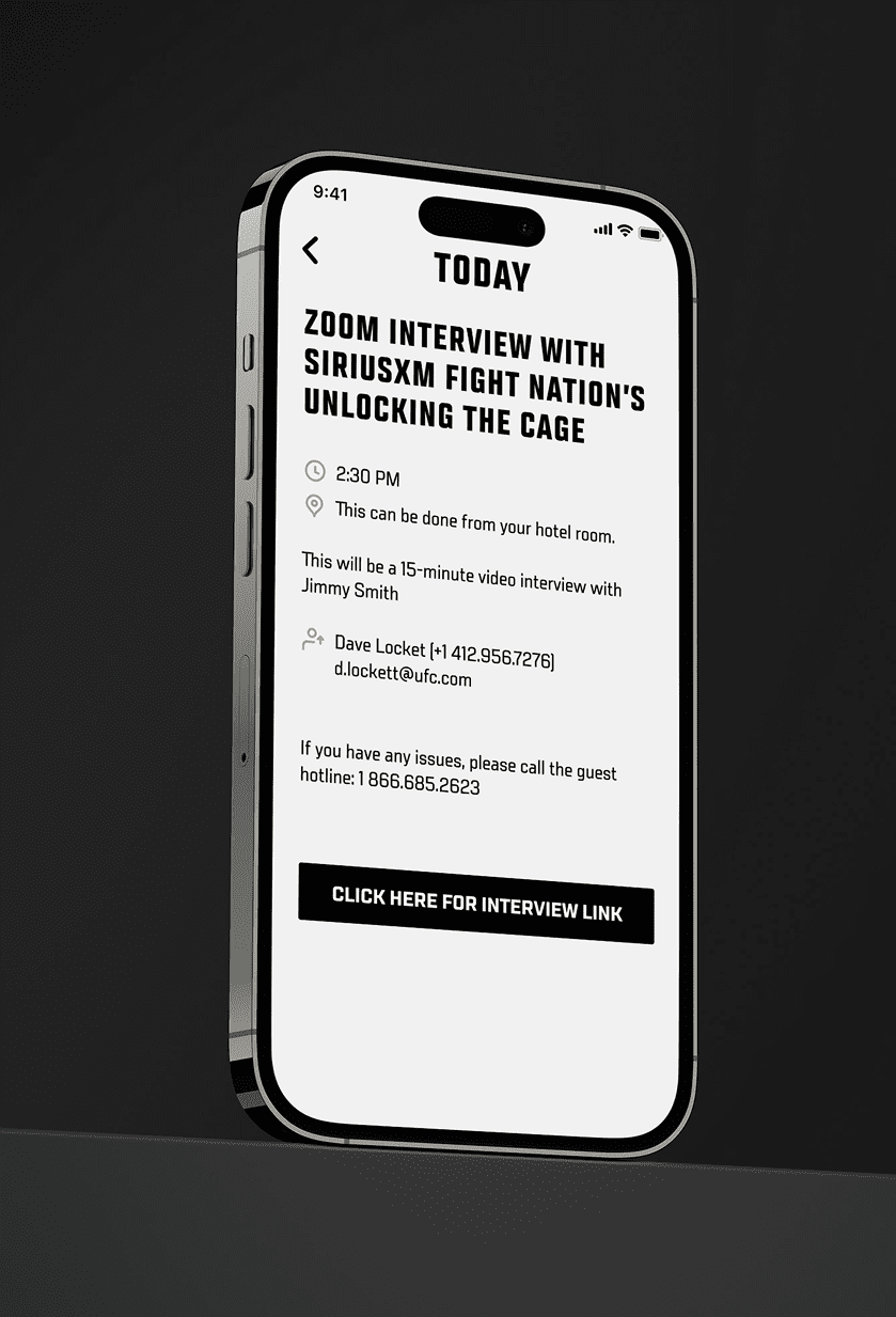 The UFC mobile app was designed with fighters in mind. From personalized fight calendars to detailed itineraries, hotel details, and shuttle information, everything fighters need to prepare for an event is available in one place.